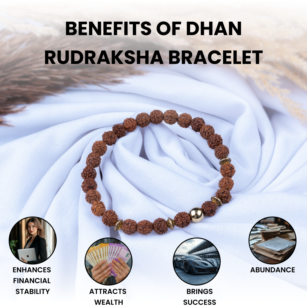 The Dhan Rudraksha Bracelet is a sacred accessory believed to bring wealth and abundance. Made with genuine rudraksha beads, its said to attract financial prosperity, remove obstacles, and enhance luck in money matters.