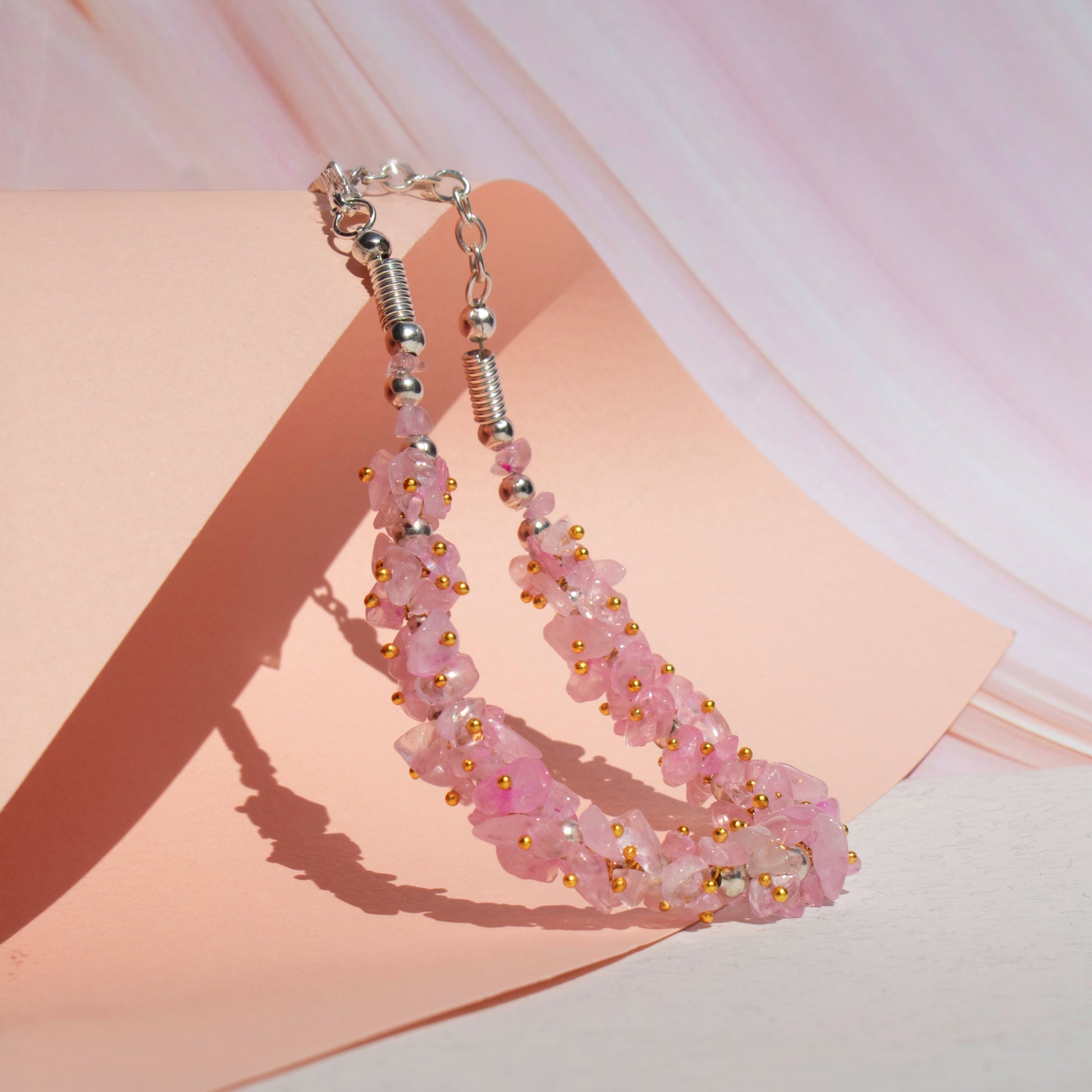 Love Attraction chips bracelet is a beautiful pink crystal known for its gentle and loving energy. Its a popular choice for those looking to attract love, strengthen relationships, and promote self-love.